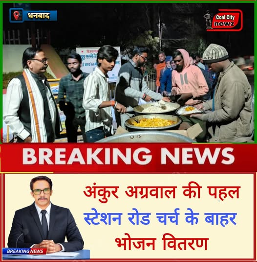 #कोल_सिटी_न्यूज़#धनबाद9102277708:- धनबाद। स्टेशन रोड स्थित चर्च के बाहर महापौर प्रत्याशी अमित कुमार अग्रवाल के भाई अंकुर अग्रवाल की ओर से असहाय एवं जरूरतमंद लोगों के बीच भोजन का वितरण किया गया। इस दौरान बड़ी संख्या में गरीबों, श्रमिकों एवं राहगीरों को सम्मानपूर्वक भोजन कराया गया।