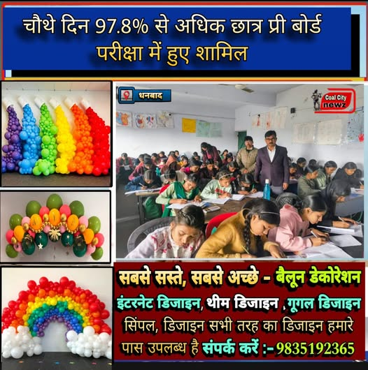 #कोल_सिटी_न्यूज़#धनबाद :- उपायुक्त सह जिला दंडाधिकारी श्री आदित्य रंजन के निर्देश पर बोर्ड परीक्षा से पहले आयोजित मैट्रिक एवं इण्टरमीडिएट की द्वितीय प्री-बोर्ड तथा 9वीं एवं 11वीं की प्रथम प्री-बोर्ड परीक्षा के चौथे दिन जिले की स्कूलों में औसत 97.8% से अधिक छात्र शामिल हुए। वहीं झरिया राज प्लस टू उच्च विद्यालय, शिवाजी प्लस टू उच्च विद्यालय बेनागोड़िया, उत्क्रमित उच्च विद्यालय जामाडोबा, प्लस टू हाई स्कूल मैरनवाटांड़, पीएम श्री कस्तूरबा गांधी बालिका विद्यालय झरिया, प्लस टू हाई स्कूल पुटकी, पीएम श्री कस्तूरबा गांधी बालिका विद्यालय बलियापुर, उत्क्रमित प्लस टू हाई स्कूल कोलाकुसमा में 100% छात्र उपस्थित रहे।