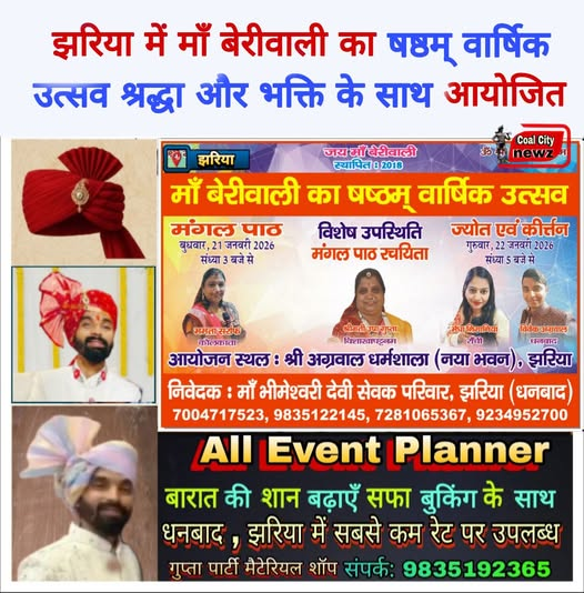झरिया में माँ बेरीवाली का षष्ठम् वार्षिक उत्सव भक्ति एवं आस्था के वातावरण में आयोजित किया जा रहा है। इस पावन अवसर पर बुधवार, 21 जनवरी 2026 को संध्या 3 बजे से मंगल पाठ का आयोजन होगा, जिसमें मंगल पाठ के रचयिता की विशेष उपस्थिति रहेगी।