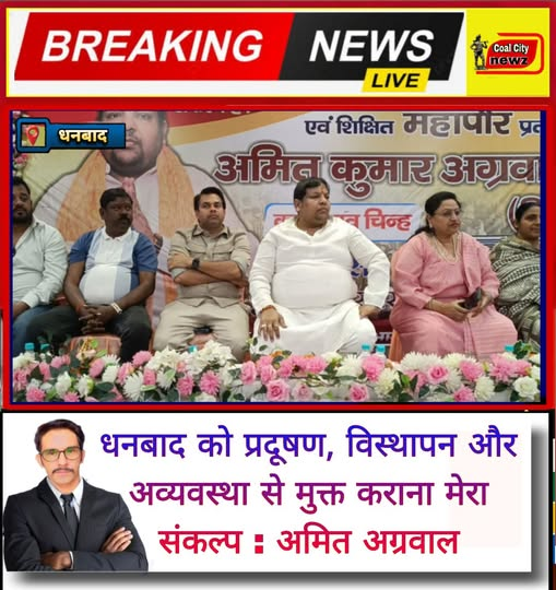 अमित अग्रवाल ने धनबाद नगर निगम के 55 वार्डों में विकास की स्थिति को चिंताजनक बताते हुए कहा कि कोयले की राजधानी होने के बावजूद यहां की जनता प्रदूषण, विस्थापन, शुद्ध पेयजल, जर्जर सड़कों, कचरा प्रबंधन और बिजली जैसी बुनियादी समस्याओं से जूझ रही है।