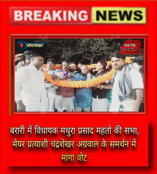 #कोल_सिटी_न्यूज़#जोड़ापोखर(#काजल_राय):- मथुरा प्रसाद महतो ने बरारी में आयोजित आम सभा में झामुमो समर्थित मेयर प्रत्याशी चंद्रशेखर अग्रवाल के पक्ष में लोगों से मतदान की अपील की।