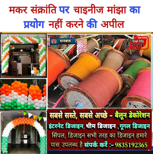 #कोल_सिटी_न्यूज़#धनबाद :- उपायुक्त सह जिला दंडाधिकारी श्री आदित्य रंजन ने मकर संक्रांति पर्व को लेकर जिले के नागरिकों से सतर्क और जिम्मेदार व्यवहार अपनाने तथा पतंग उड़ाते समय चाइनीज मांझा (चाइनीज धागा) का प्रयोग नहीं करने की अपील की है।