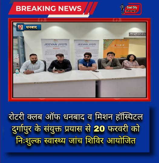 #कोल_सिटी_न्यूज़#धनबाद:- 18 फरवरी 2026 को बेकारबांध स्थित जीवन ज्योति विशेष विद्यालय प्रांगण में रोटरी क्लब ऑफ धनबाद द्वारा प्रेस वार्ता आयोजित की गई। अध्यक्ष नवल उपाध्याय ने बताया कि 20 फरवरी को रोटरी (बिहार-झारखंड) की जिलापाल नम्रता नाथ के आगमन पर रोटरी क्लब ऑफ धनबाद एवं द मिशन हॉस्पिटल, दुर्गापुर के संयुक्त तत्वावधान में निःशुल्क स्वास्थ्य परीक्षण सह परामर्श शिविर आयोजित होगा।