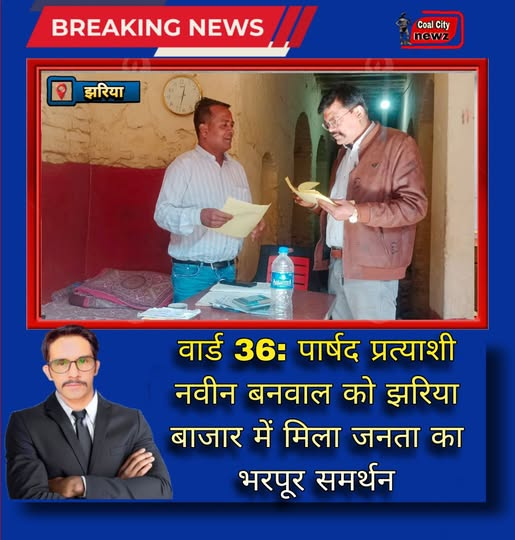 #कोल_सिटी_न्यूज़#झरिया/#धनबाद910227770:- धनबाद नगर निगम के वार्ड नंबर 36 से पार्षद प्रत्याशी नवीन बनवाल ने सोमवार को झरिया बाजार क्षेत्र में व्यापक जनसंपर्क अभियान चलाया। इस दौरान उन्होंने दुकानदारों, स्थानीय नागरिकों और युवाओं से सीधे संवाद कर क्षेत्र की समस्याओं और विकास की जरूरतों को सुना।