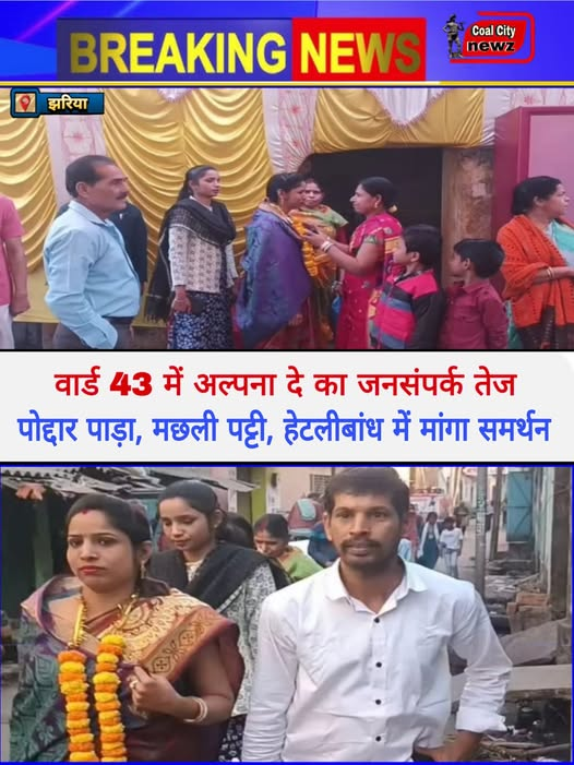 #कोल_सिटी_न्यूज़#झरिया(#धनबाद):- धनबाद, नगर निगम चुनाव के मद्देनजर वार्ड 43 की पार्षद प्रत्याशी अल्पना दे ने पोद्दार पाड़ा, मछली पट्टी, हेटलीबांध में व्यापक जनसंपर्क अभियान चलाकर स्थानीय लोगों से समर्थन और आशीर्वाद मांगा।