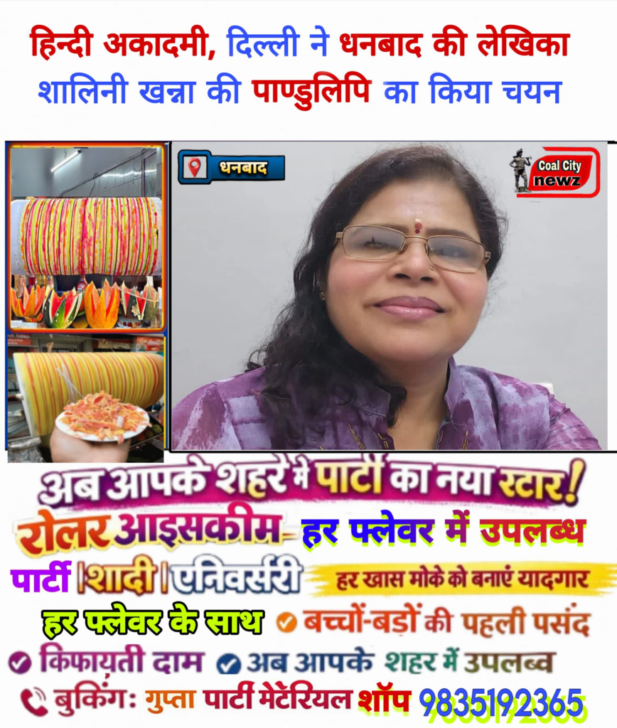 #कोल_सिटी_न्यूज़#धनबाद(9102277708):- प्रतिभा किसी भूगोल या सीमा की मोहताज नहीं होती—इस कथन को धनबाद की लेखिका एवं समाजसेविका शालिनी खन्ना ने साकार कर दिखाया है। भारत सरकार के कला, संस्कृति एवं भाषा विभाग के अंतर्गत कार्यरत हिन्दी अकादमी, दिल्ली ने पुस्तक प्रकाशन सहयोग योजना के तहत उनकी पुस्तक ‘आप्यायन’ की पाण्डुलिपि का चयन किया है।