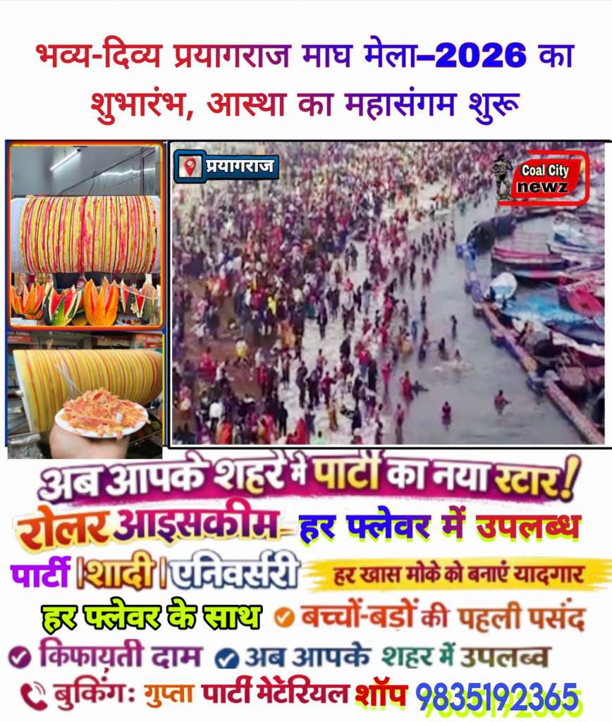#कोल_सिटी_न्यूज़#प्रयागराज:- प्रयागराज में भव्य और दिव्य माघ मेला–2026 का शुभारंभ श्रद्धा, आस्था और आध्यात्मिक उल्लास के साथ हुआ। संगम तट पर गंगा, यमुना और अदृश्य सरस्वती के पावन संगम में स्नान के साथ लाखों श्रद्धालुओं ने पुण्य लाभ अर्जित किया।